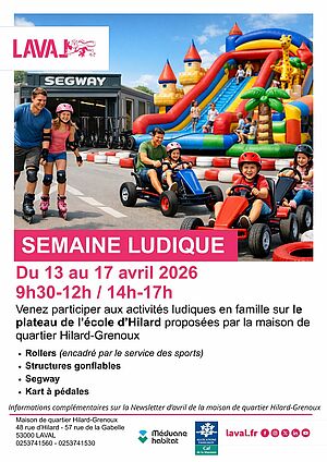 Du 13 au 17 avril, la maison de quartier Hilard-Grenoux vous propose une semaine ludique dédiée aux familles ! Chaque jour, petits et grands pourront profiter d’activités amusantes et sportives en accès libre sur le plateau de l’école. Un moment convivial pour partager, bouger et s’amuser ensemble pendant les vacances.