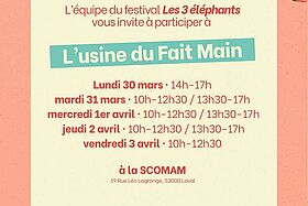 À l’approche du festival Les 3 Éléphants 2026, les habitants de Laval et des environs sont invités à prendre part à L’usine du Fait Main, une série d’ateliers créatifs ouverts à tous. Organisé à la SCOMAM, cet événement propose de participer collectivement à la fabrication d’éléments de décoration qui habilleront le festival.